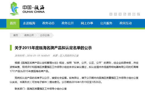 甌海區(qū)人民政府網(wǎng)站最近發(fā)布公告稱:根據(jù)《甌海區(qū)名牌產(chǎn)品認定和管理辦法》規(guī)定,按照“科學、公開、公正、公平”的原則,經(jīng)企業(yè)自愿申報,并經(jīng)資格審查、現(xiàn)場評價和甌海區(qū)質(zhì)量強區(qū)工作領(lǐng)導(dǎo)小組全體會議審議通過,擬認定溫州市恒盛照明電器有限公司的燈具等17個產(chǎn)品為2015年度甌海名牌產(chǎn)品。此次同步進入的同行還有浙江正輝照明工程有限公司及浙江森馬企業(yè)等知名企業(yè)。